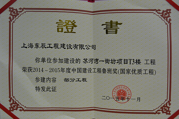 蘇河灣T3樓工程,地處黃浦區(qū)、新靜安區(qū)和虹口區(qū)三區(qū)交界處,步行至外灘及南京路只需十分鐘不到的時間。一街坊項目總建筑面積23萬㎡,其中T3樓29574㎡。地下室三層,采用地下連續(xù)墻。整個項目總投資額15億元,其中T3樓7289萬元。魯班獎是國內(nèi)建筑工程領(lǐng)域的高榮譽,以其“標(biāo)準(zhǔn)高、質(zhì)量優(yōu)、信譽好”的特點,贏得了社會上的廣泛關(guān)注。作為參建單位拿到魯班獎,我公司倍受鼓舞,今后也會以此為新的起點,再創(chuàng)佳績!